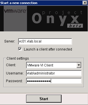 In the start new connection dialog enter you vCenter Server address and tick “Launch a client after connected”. Choose your client (In my case I will use the VI client, you can also choose powercli) and enter a valid username and password and click Start.