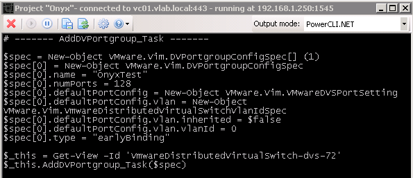 All (well most!) operations that you perform in the VI client will be captured in Onyx so you can grab the code. As an example I created a vDS portgroup called OnyxTest and you can see the output below