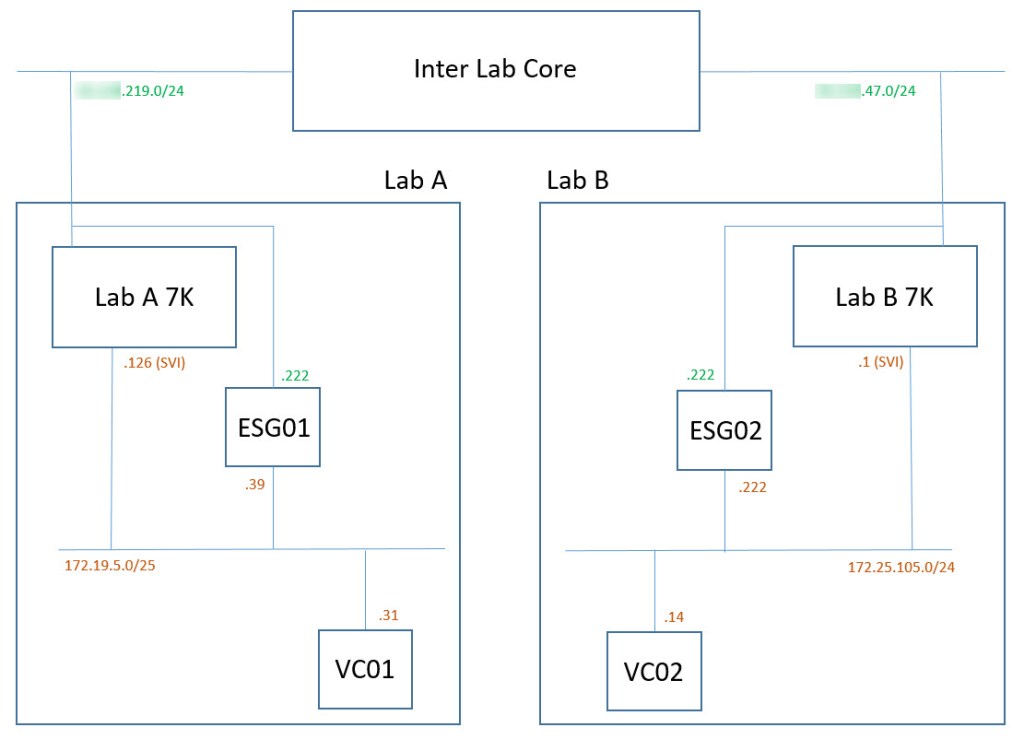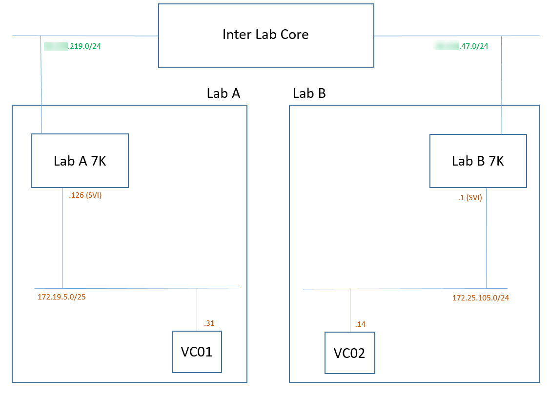 - VC01 in Lab A cannot currently communicate with VC02 in Lab B