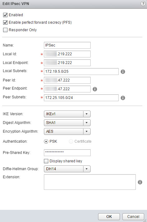 - Peer Id: We used the remote “public” IP address but this can be any friendly name. It will be entered on the target side as the local Id