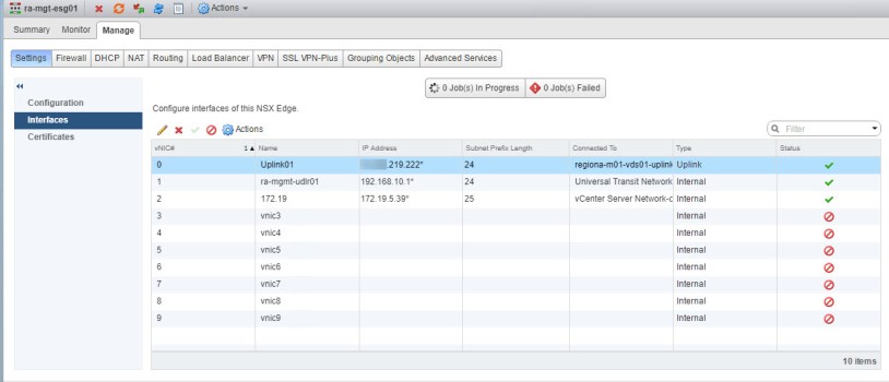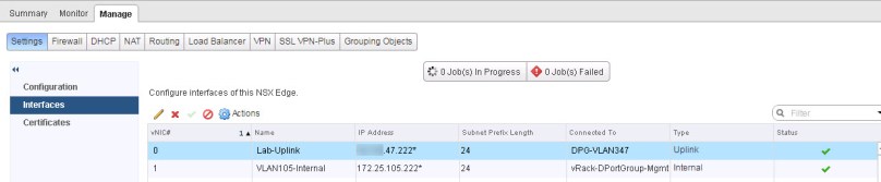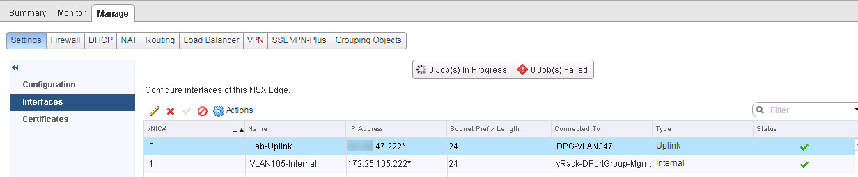 To get the inter lab communications working we opted for an IPSec VPN, which essentially gives you a secure encrypted virtual private network between sites. To facilitate the VPN connectivity we deployed an NSX edge in each lab and configured some additional interfaces: