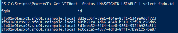 Get-VCFHost -Status UNASSIGNED_USEABLE | select fqdn,id