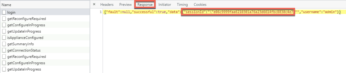 The Response tab shows a sessionId which can be used for further configuration API calls in the headers as dr.config.service.sessionid