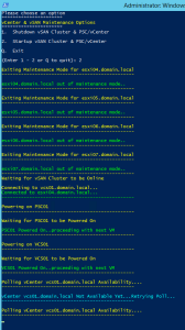 The inverse applies when powering up the environment. So rather than connect to multiple different interfaces to execute the power down or power up operations I put together the following Menu based PowerCli script with the following Options