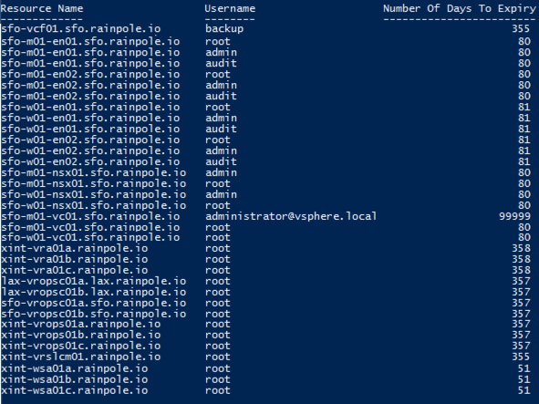Within a VMware Cloud Foundation instance, SDDC Manager is used to manage the lifecycle of passwords (or credentials). While we provide the ability to rotate (either scheduled or manually) currently there is no easy way to check when a particular password is due to expire, which can lead to appliance root passwords expiring, which will cause all sorts of issues. The ability to monitor expiry is something that is being worked on, but as a stop gap I put together the script below which leverages PowerVCF and also a currently undocumented API for validating credentials.