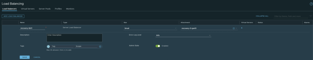 The next step is to ensure we have an active load balancer running in the recovery site to ensure our protected applications come up correctly. To do this log into what is now our active GM, select the recovery site NSX Local Manager (LM), and navigate to Networking > Load Balancing. Edit the load balancer and attach it to the recovery site standalone Tier-1.