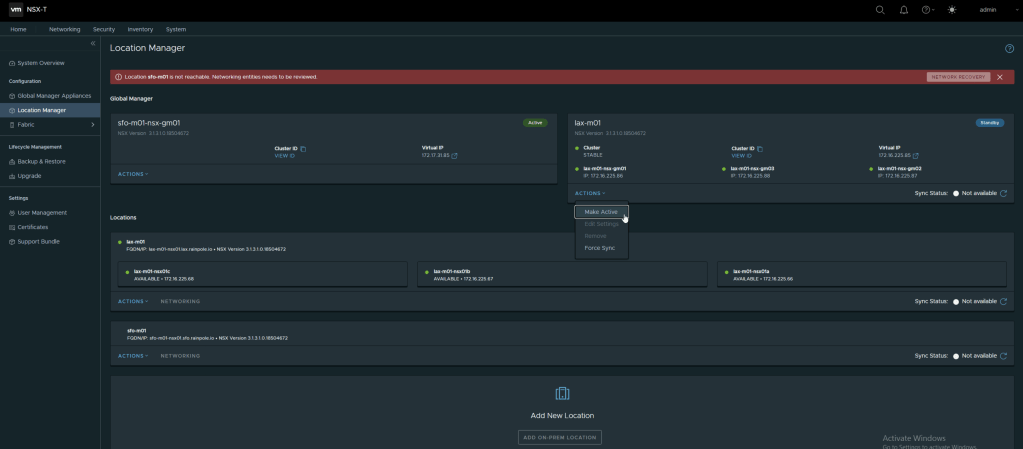First? Fix the network! Log into the passive NSX Global Manager (GM) on the recovery site and promote the GM to Active. (Note: This can take about 10-15 mins)