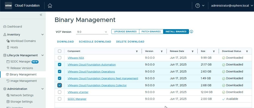 As I do not have VCF Operations or VCF Automation in my VCF 5.2 environment, and I need to install them as part of VCF 9.0, navigate to Install Binaries and select each one and click Download.