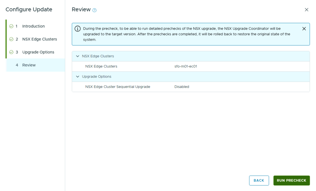 Once your upgrade binaries are downloaded, the next step is to upgrade NSX. Once again, navigate to Workload Domains > Management Workload Domain > Updates, and click Run Precheck and ensure all prechecks pass.