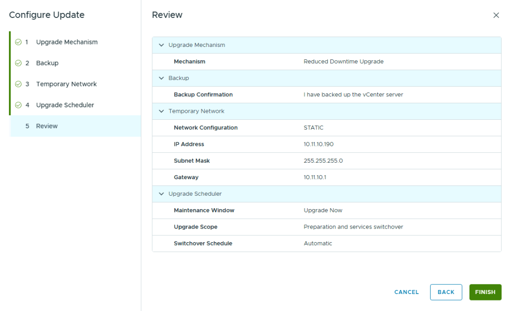 The next step in the upgrade process is to upgrade vCenter. VCF 9.0 supports what is called Reduced Downtime Upgrade (RDU). RDU deploys a new vCenter appliance and copies the data from the old appliance. This drastically reduces the downtime as it is just a personality switchover that needs to happen after all the data is copied over. You need a free IP address in the same subnet as the vCenter. It does not require a DNS entry.