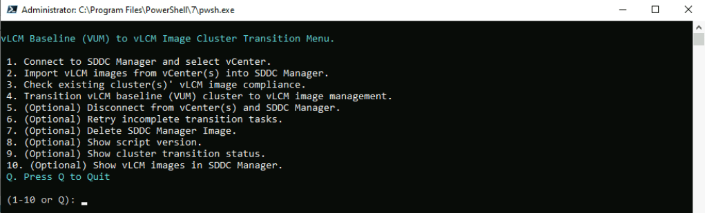 To Transition a vLCM baseline (VUM) cluster to vLCM image management, choose option 4. Enter a cluster id, and Confirm you have reviewed the image compliance findings. The transition process will begin.