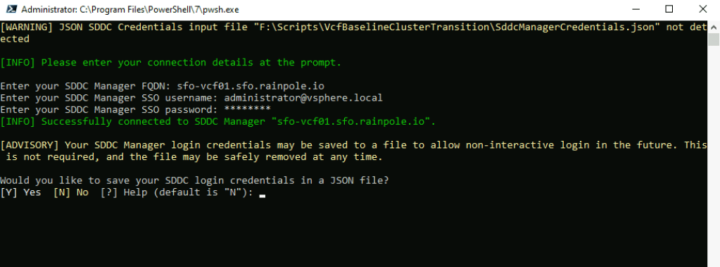 Choose option 1 to Connect to SDDC Manager and select vCenter. Enter the SDDC Manager FQDN and credentials and decide whether you want to save the credentials to a json file for future use.
