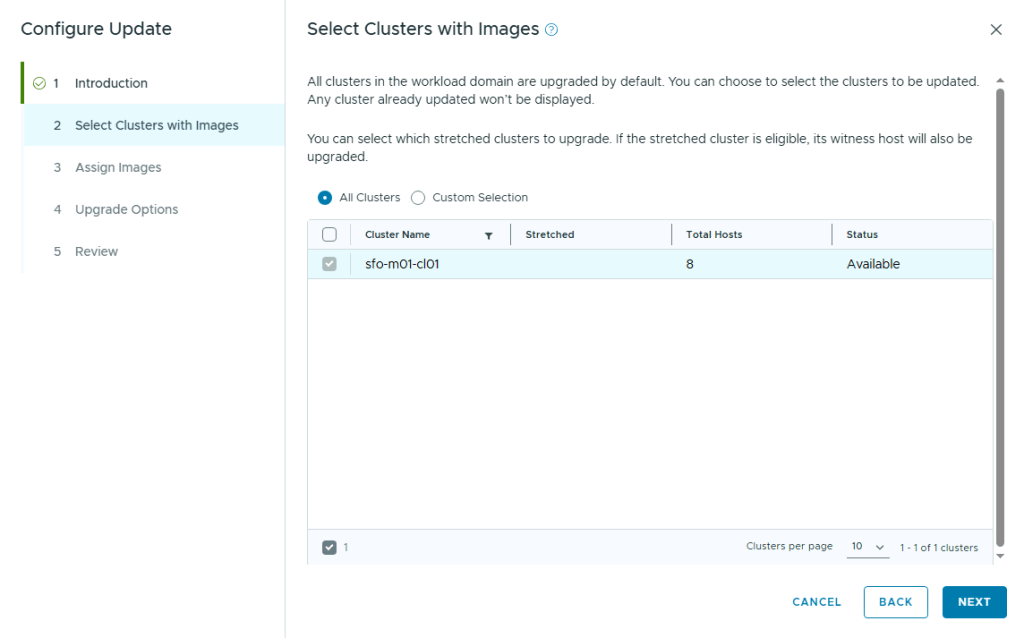 On the Select Clusters with Images pane, select the clusters to be upgraded, and click Next.