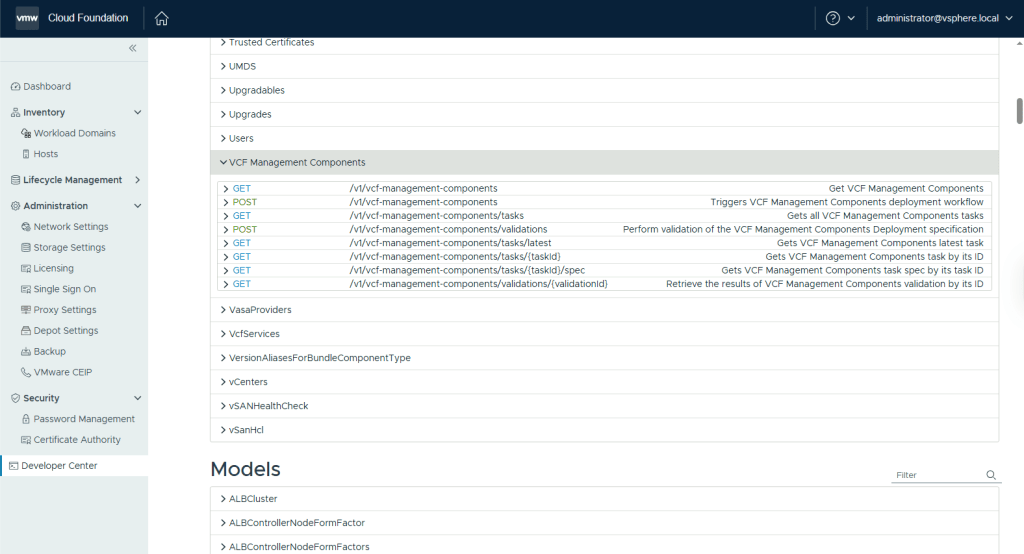The API can be accessed via the SDDC Manager developer centre, under VCF Management Components.