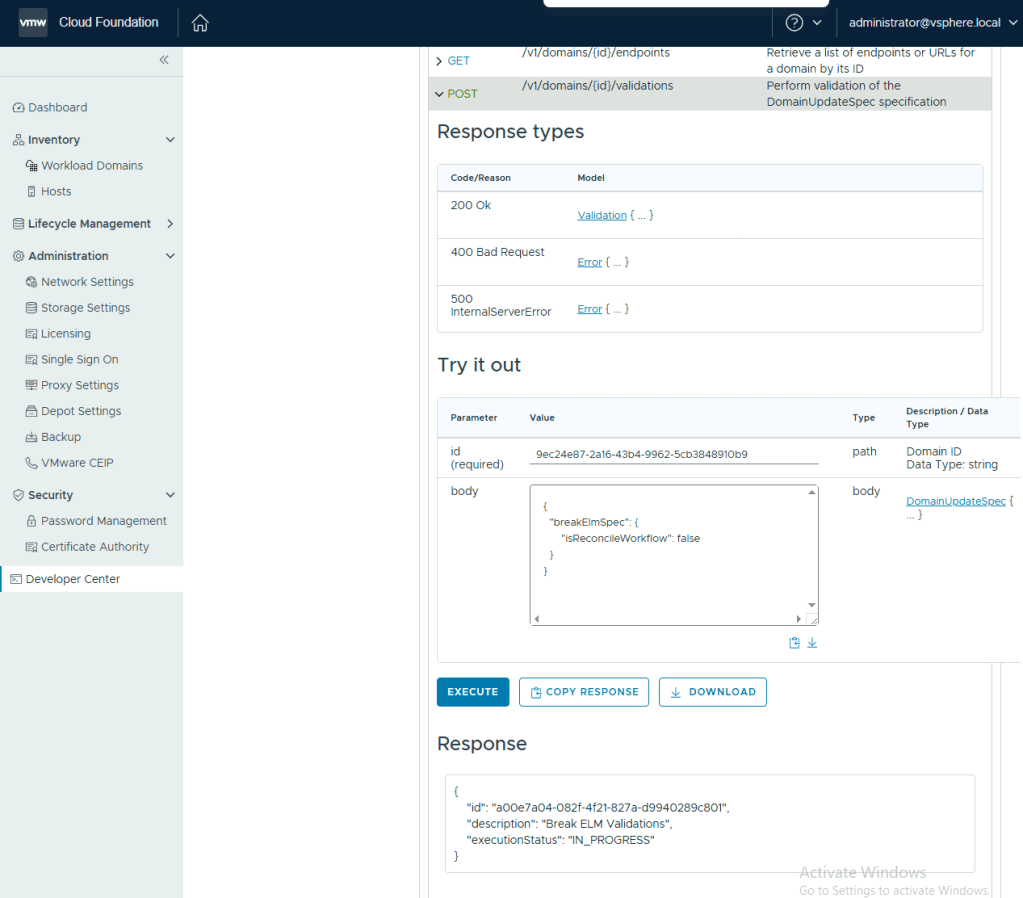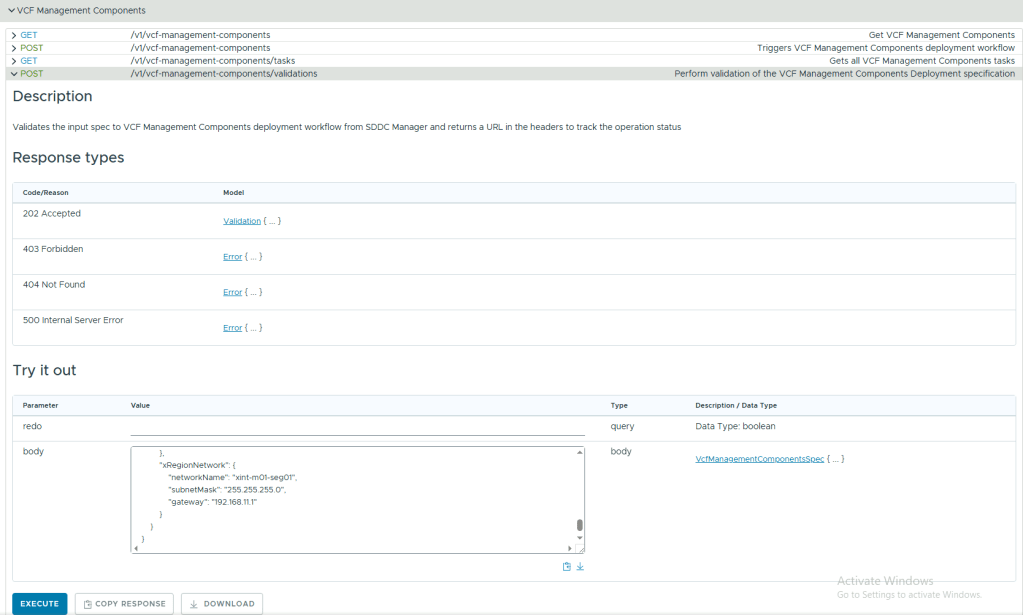 • Expand POST /v1/domains/{id}/validations , enter the management domain id in the id field and the following json in the body, and click Execute.