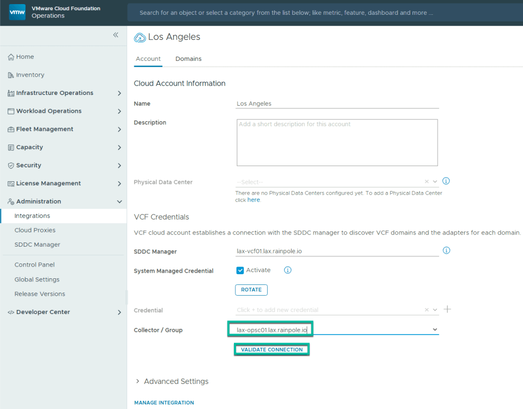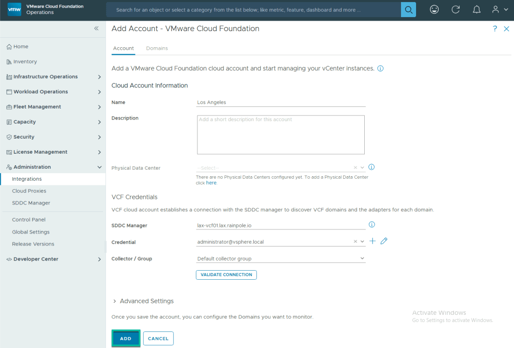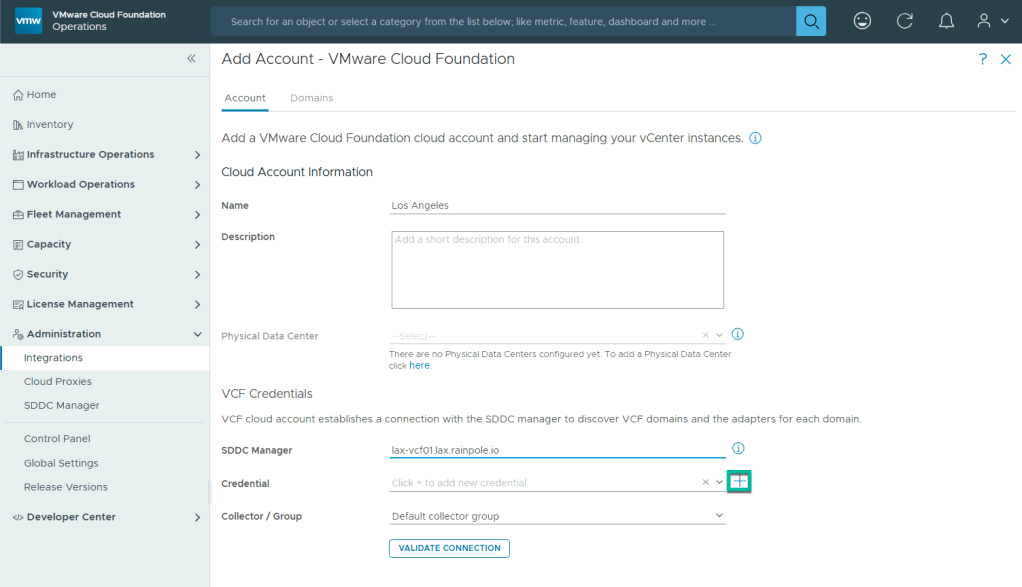 Next, create a new VMware Cloud Foundation integration in VCF Operations for the SDDC Manager of the additional VCF instance.