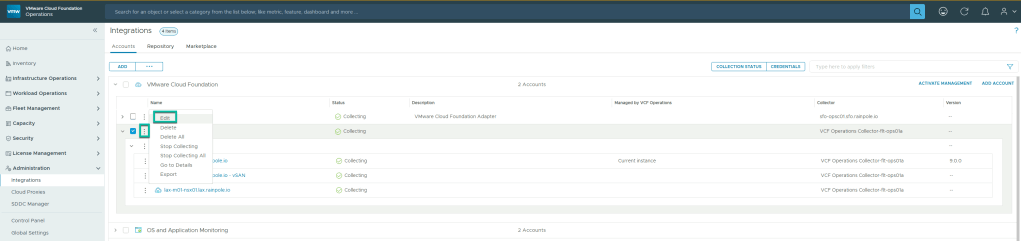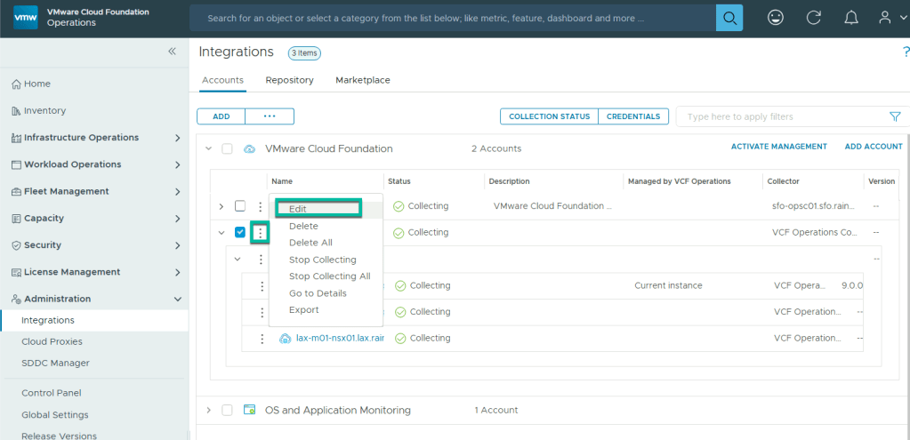 • On the Integrations screen, expand VMware Cloud Foundation and expand the new Integration. Click the vertical ellipsis at the VCF instance level and click Edit.