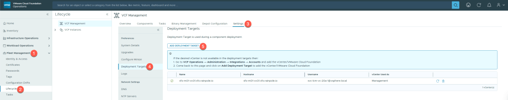 • Add the new management domain vCenter as a deployment target in fleet management.