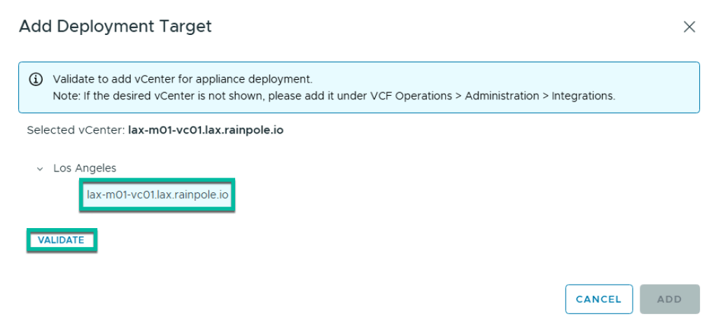 The Add Deployment Target wizard will find vCenter instances that are configured as a VCF integration and present a list to choose from.