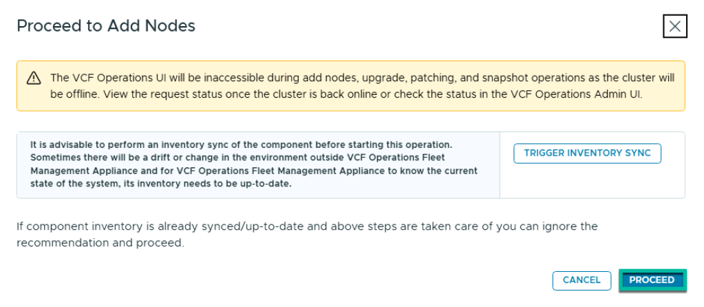 • Before adding new nodes to the VCf Operations cluster, it is advisable to perform an inventory sync to avoid any drift. Click Trigger Inventory Sync.