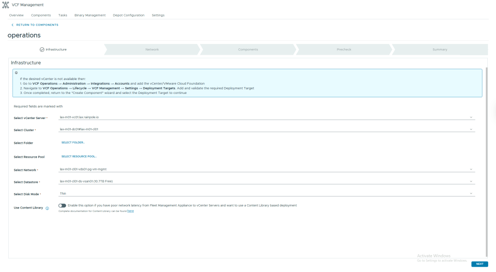 • On the Infrastructure screen, select the newly added management domain vCenter from the drop down and select the target cluster, network and datastore and click Next.