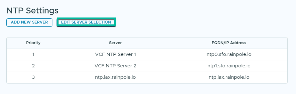• If additional NTP servers are required, under NTP Settings, click Add New Server. Enter the server details and click Submit.