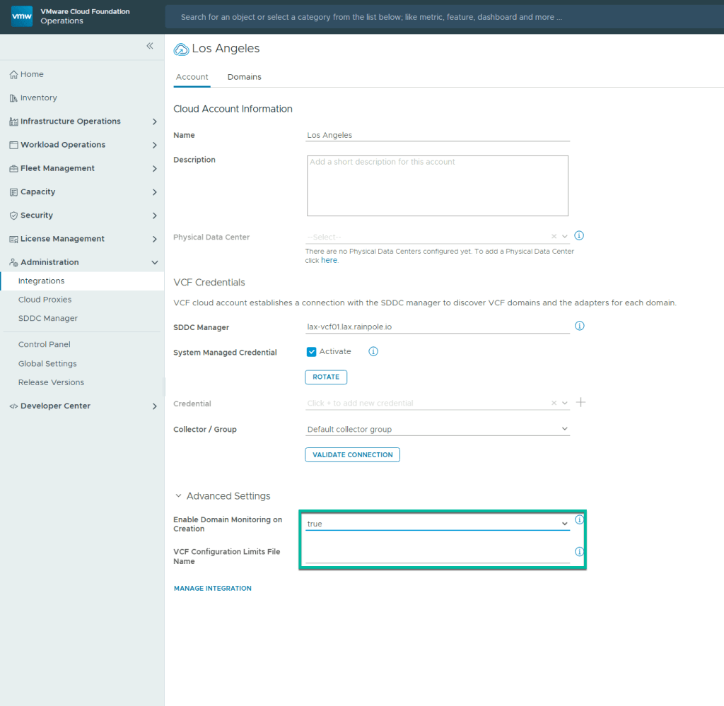 • Expand Advanced Settings, change Enable Domain Monitoring on Creation to true, and remove the VCF Configuration limits File Name (if it is populated).