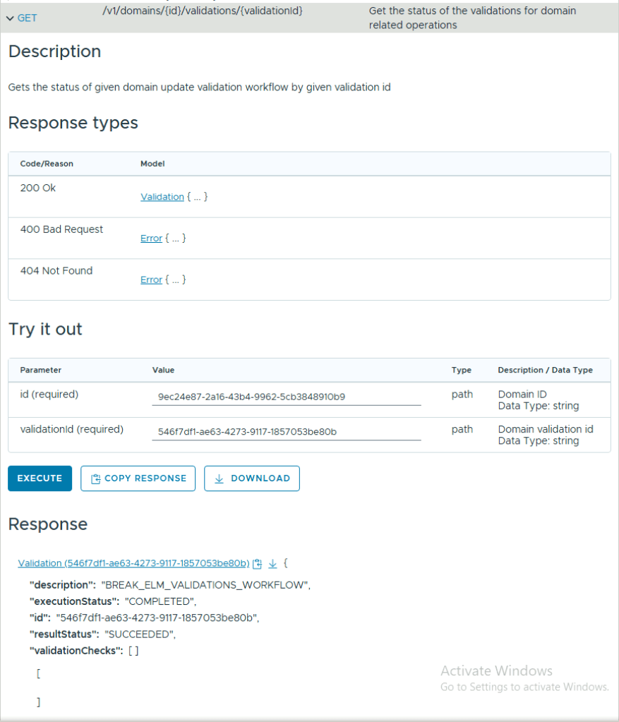 • Expand GET /v1/domains/{id}/validations/{validation_id} and replace {id} with the management domain ID. Replace {validation_id} with the validation ID, from the previous step, and click Execute. Expand the response to ensure it is successful.