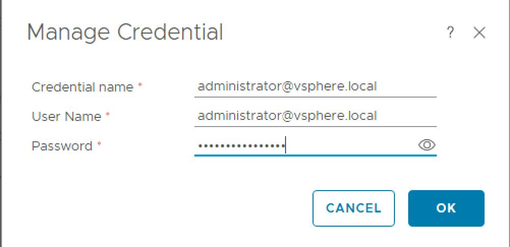 • Enter a username and password with the ADMIN role in SDDC Manager, and click OK. For now, I am using administrator@vsphere.local as we will change this to a service account later.