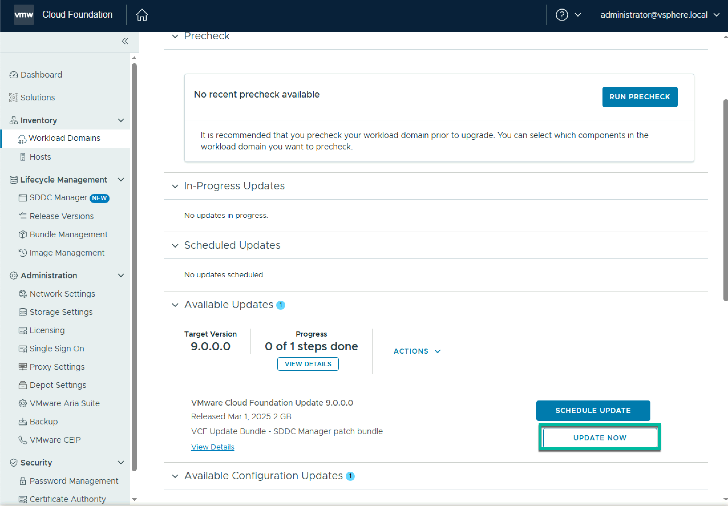 Once you have download the required SDDC Manager bundles, navigate to Workload Domains > Management Workload Domain > Updates, and click Run Precheck and ensure all prechecks pass.