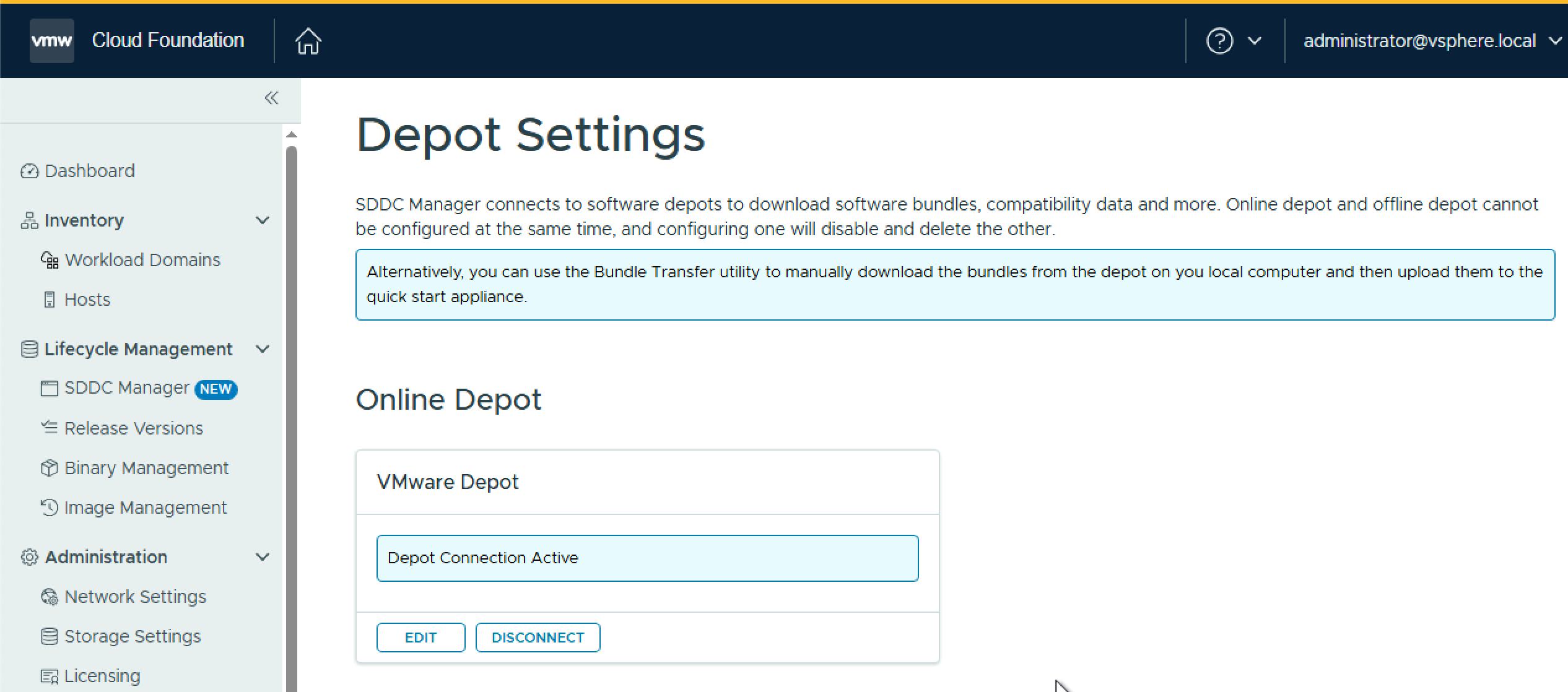Once you have upgraded SDDC Manager to 9.0, you will notice the Binary Management screen looks a little different. To enable the depot to download the remaining bundles you need, you must update the download token (again!). To do this, navigate to Depot Settings and select your depot type. In this post I will use the Online Depot. I may create another variant with an offline depot in future.
