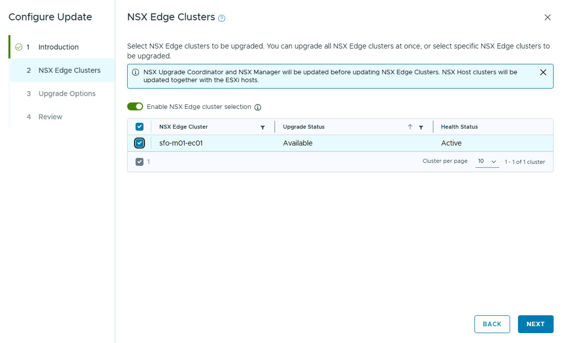 On the NSX Edge Clusters pane, you can choose to upgrade all NSX Edge Clusters, or select specific NSX Edge Clusters to upgrade. In my case, I only have one NSX Edge Cluster. Click Next.