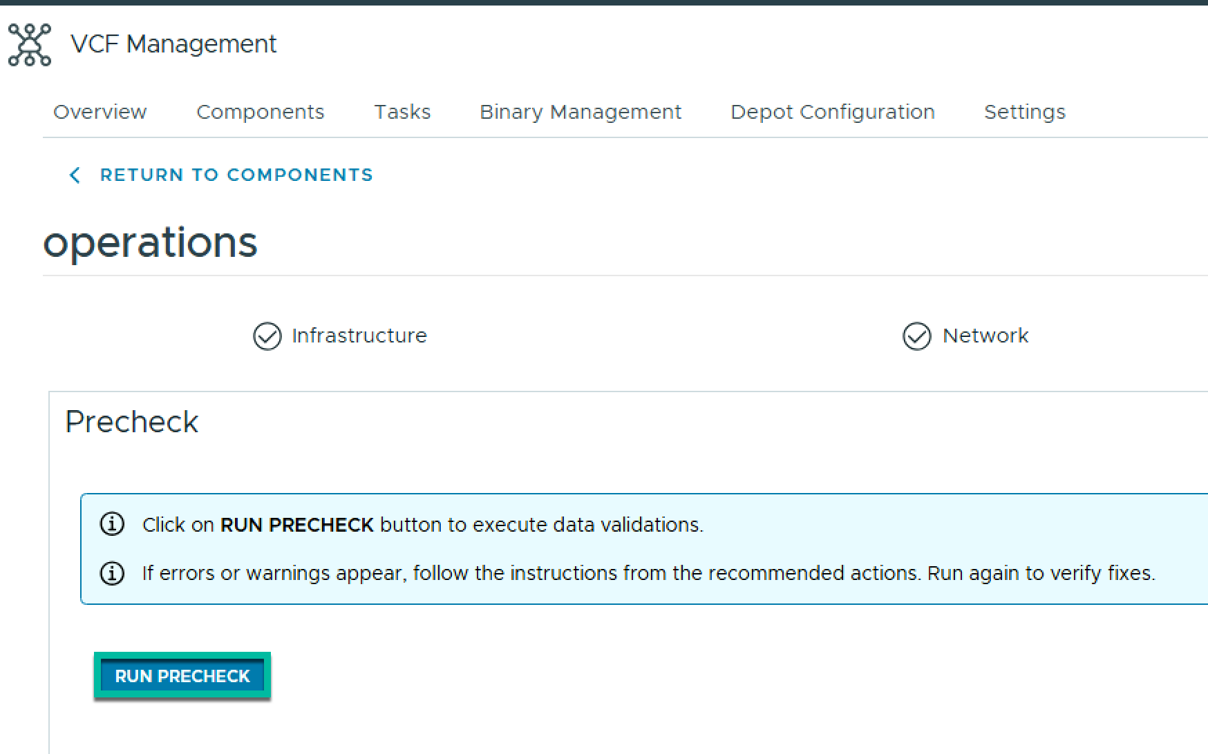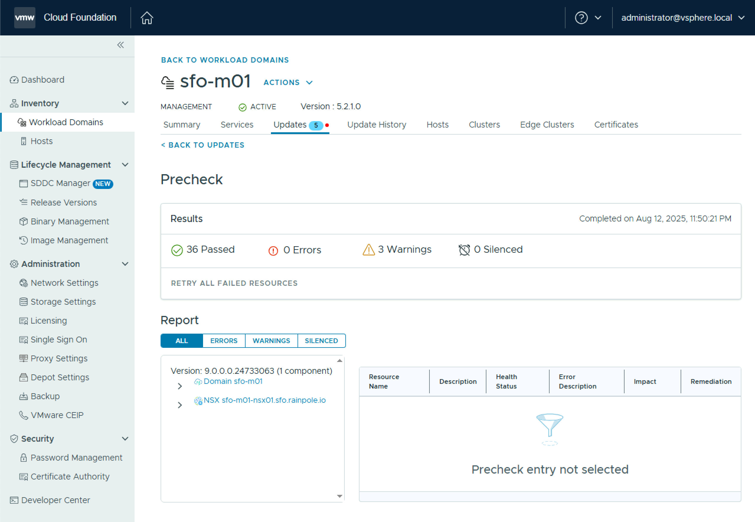 Once the vLCM image is imported, navigate to Workload Domains > Management Workload Domain > Updates, and click Run Precheck and ensure all prechecks pass.