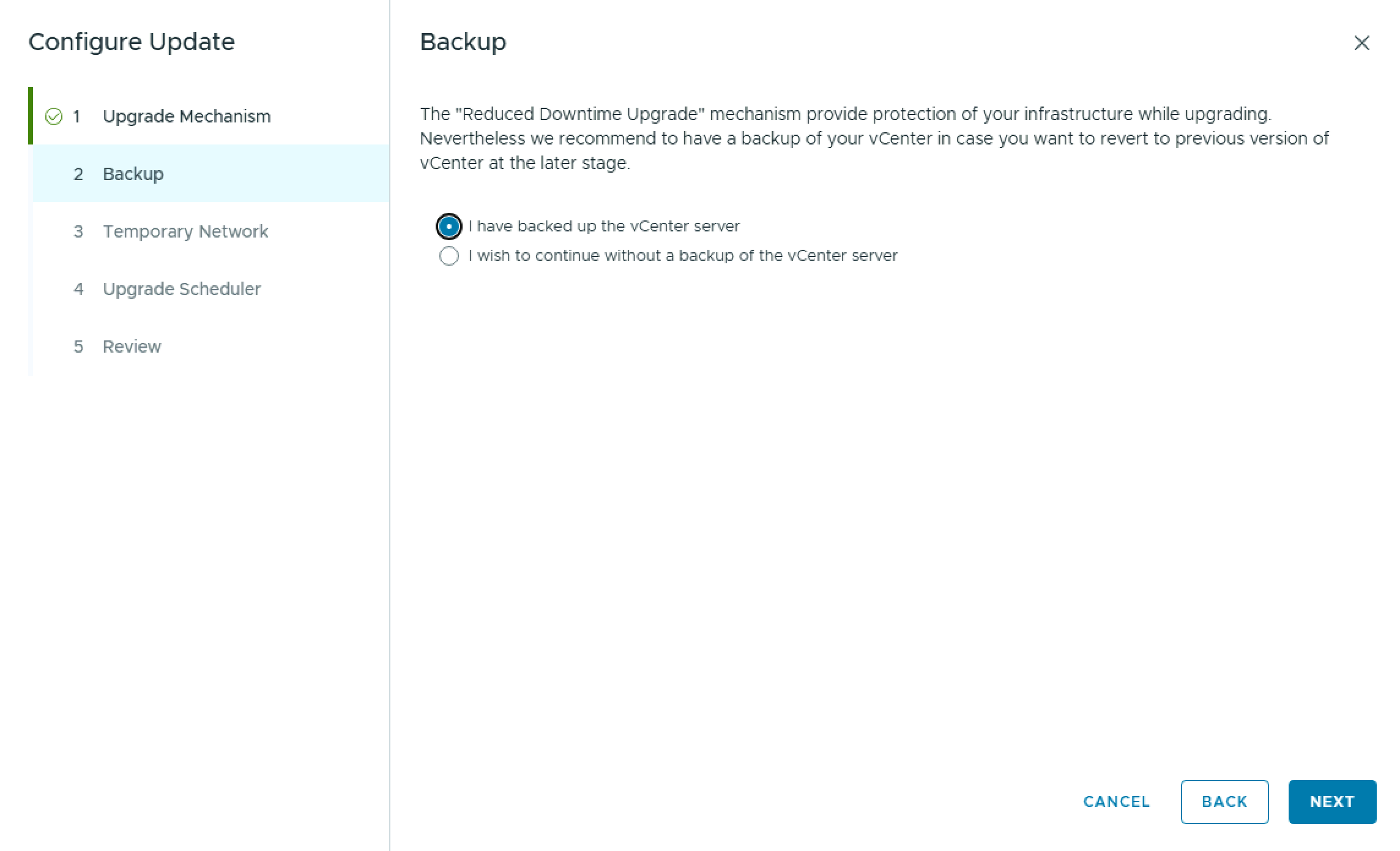 On the Backup pane, click I have backed up the vCenter server, and click Next.