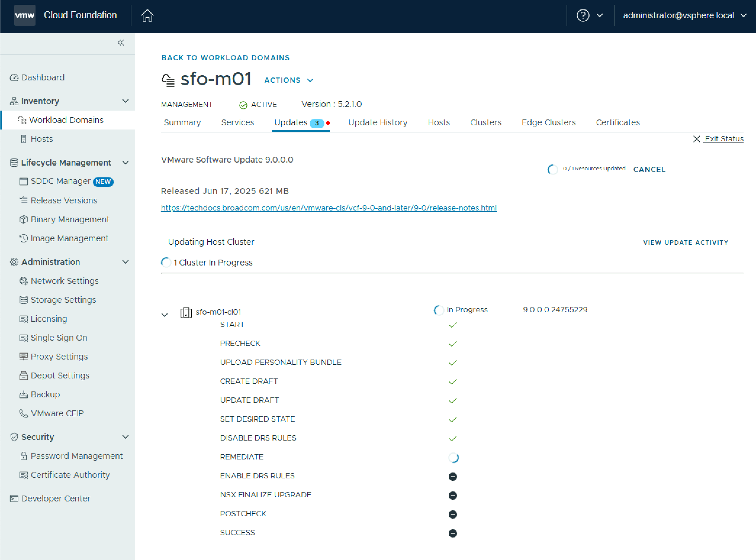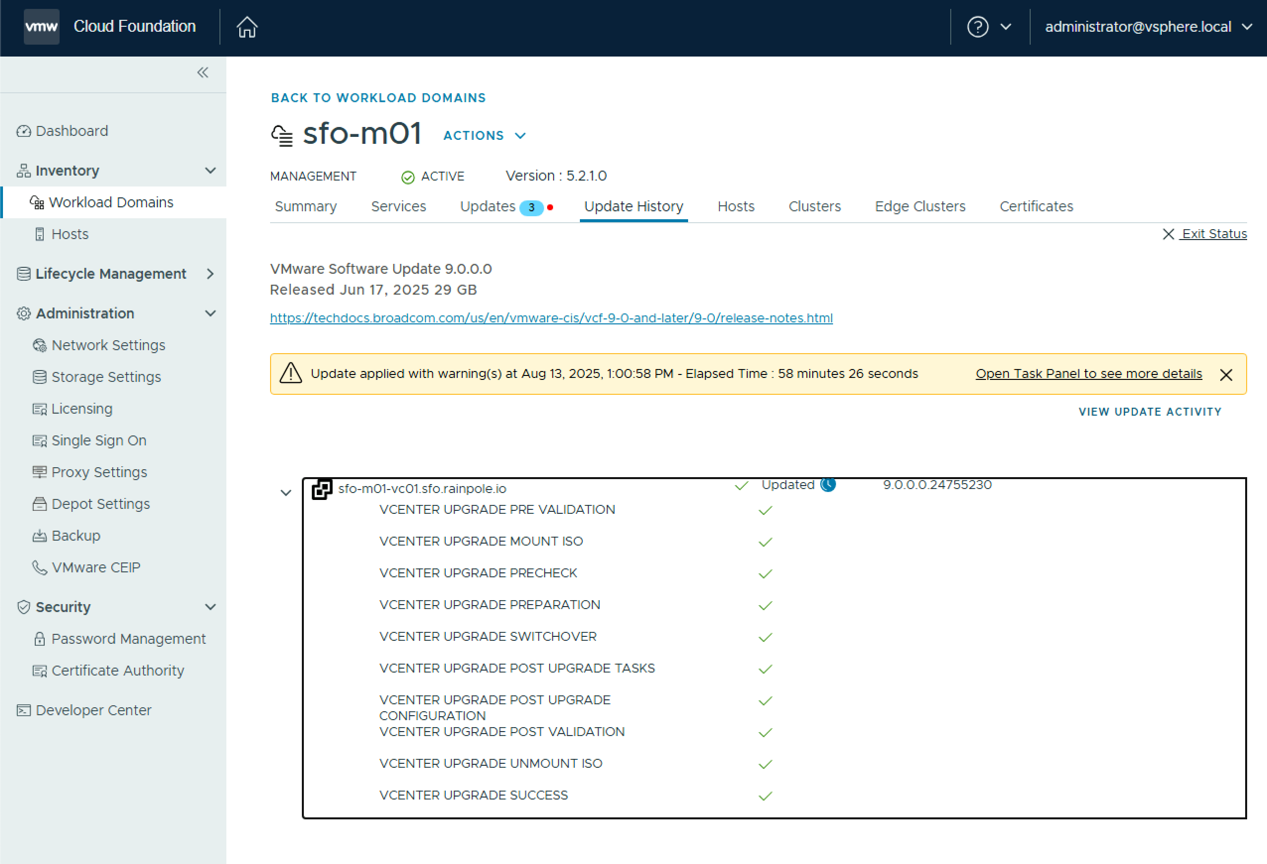 Once it completes your SDDC Manager has been upgraded to 9.0