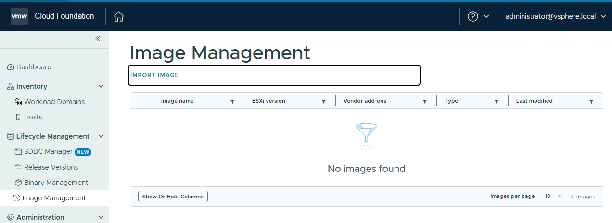 To import the image to SDDC Manager, navigate to Lifecycle Management > Image Management and click Import Image.