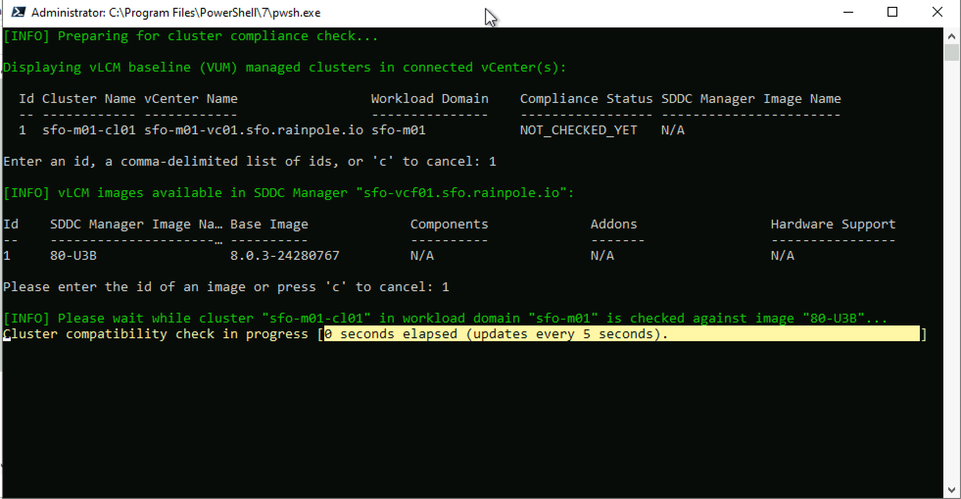 To Check existing cluster(s)’ vLCM image compliance, choose option 3. Enter a cluster id, and choose an image id to check against.