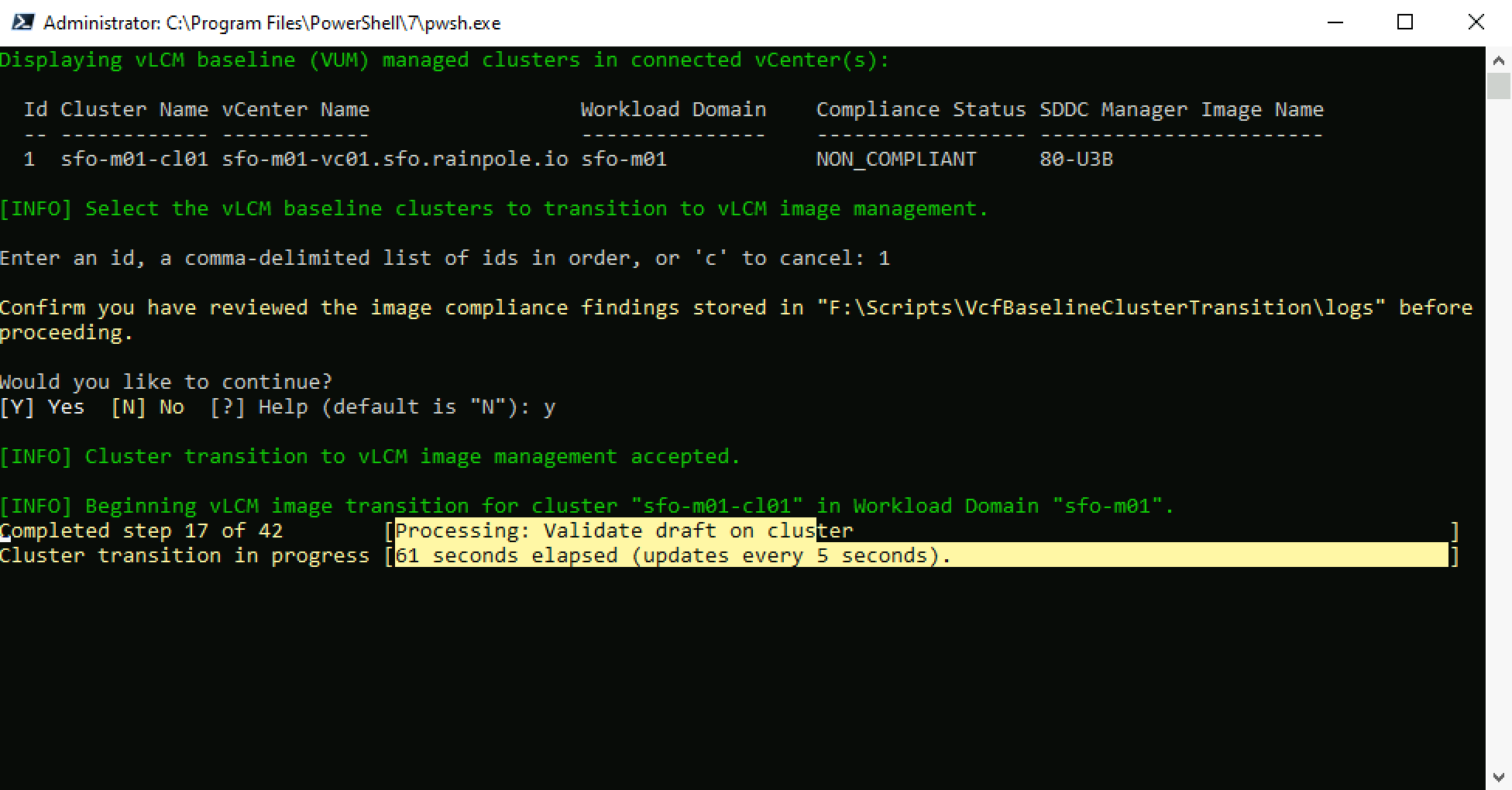 To Transition a vLCM baseline (VUM) cluster to vLCM image management, choose option 4. Enter a cluster id, and Confirm you have reviewed the image compliance findings. The transition process will begin.