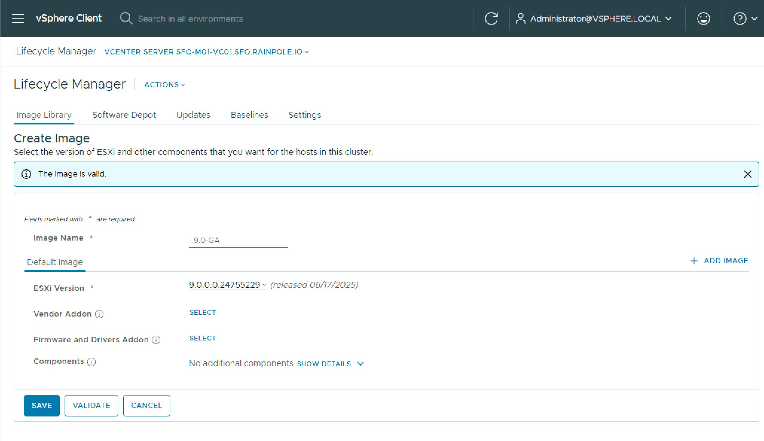 • Log into the vSphere client and navigate to Menu > Lifecycle Manager, and click Create Image.