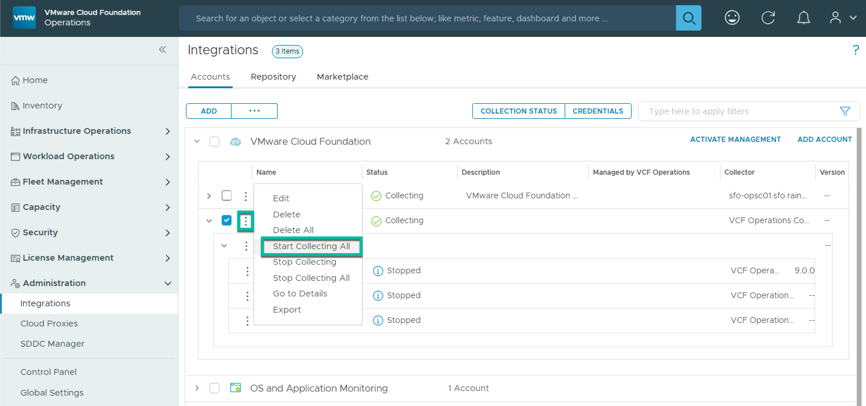 • On the Integrations screen, expand VMware Cloud Foundation and expand the new Integration. You will see that the workload domain components are in a stopped status. To start them, click the vertical ellipsis at the VCF instance level and click Start Collecting All.