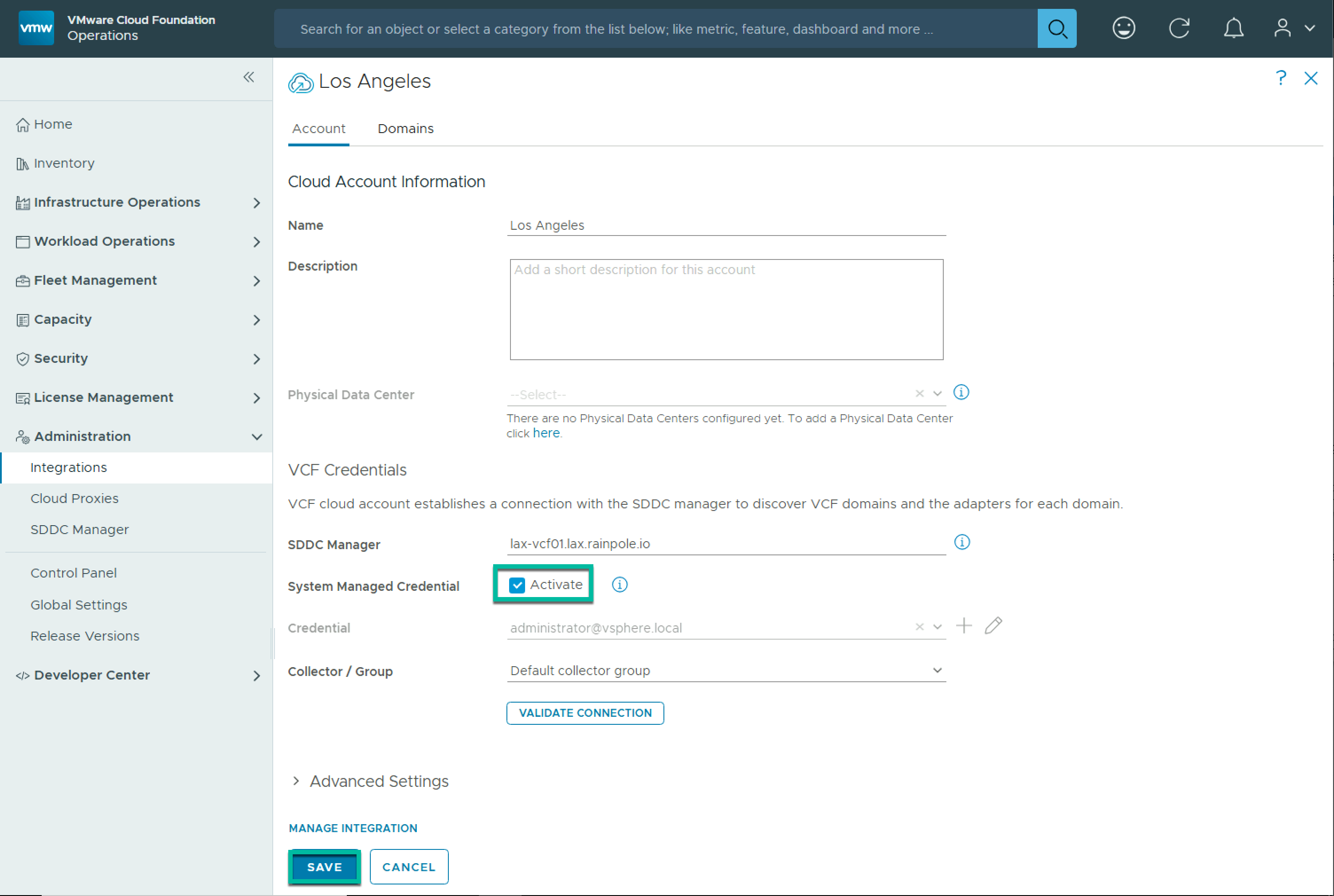 Next, create a new VMware Cloud Foundation integration in VCF Operations for the SDDC Manager of the additional VCF instance.
