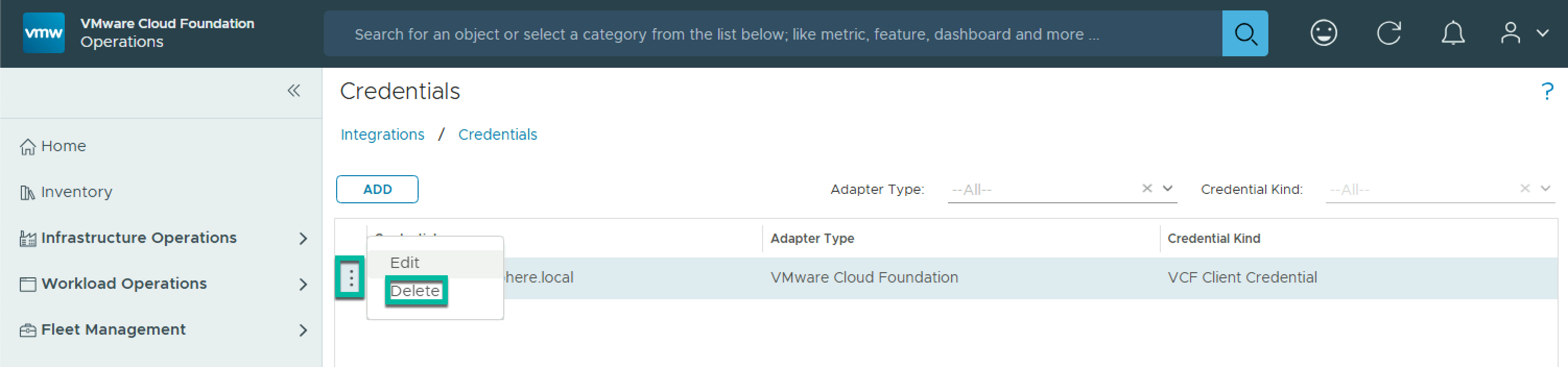 • On the Integrations screen, expand VMware Cloud Foundation and expand the new Integration. Click the vertical ellipsis at the VCF instance level and click Edit.