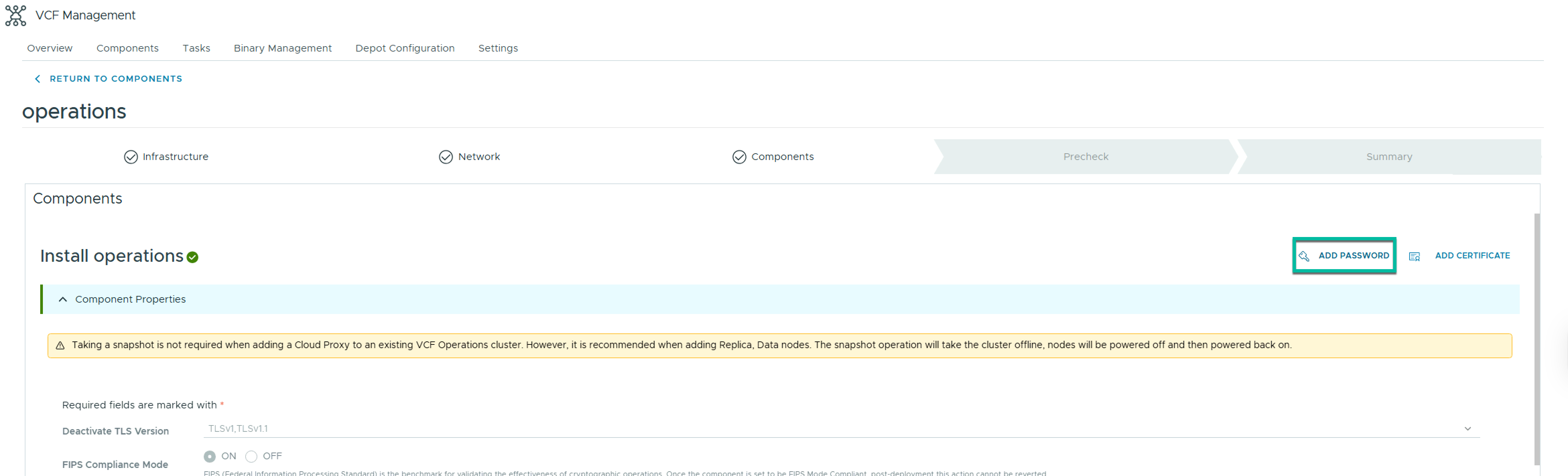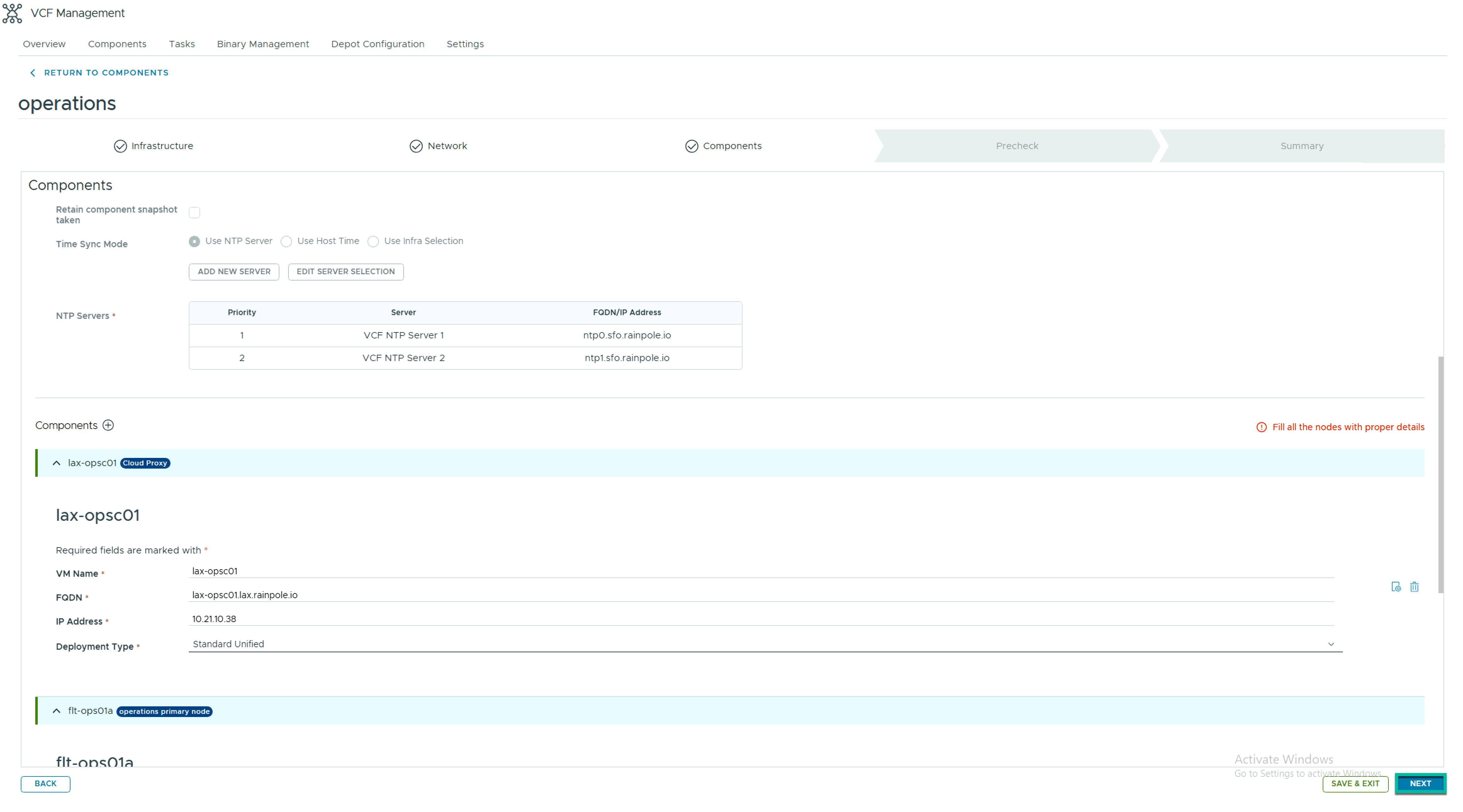 • To deploy VCF Operations collector(s) to the newly added VCF instance, navigate to Components and click operations in the components list.