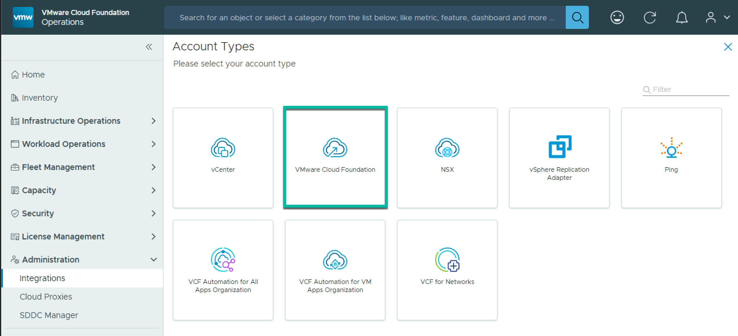 • In the VCF Operation UI, navigate to Administration > Integrations, and click Add.