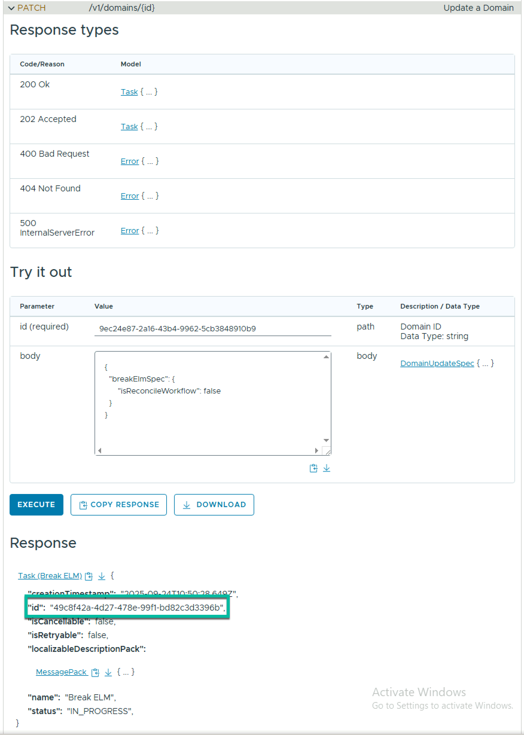 To break ELM across all VCF domains in the VCF instance, expand PATCH /v1/domains/{id} , enter the management domain id in the id field and the following json in the body, and click Execute.