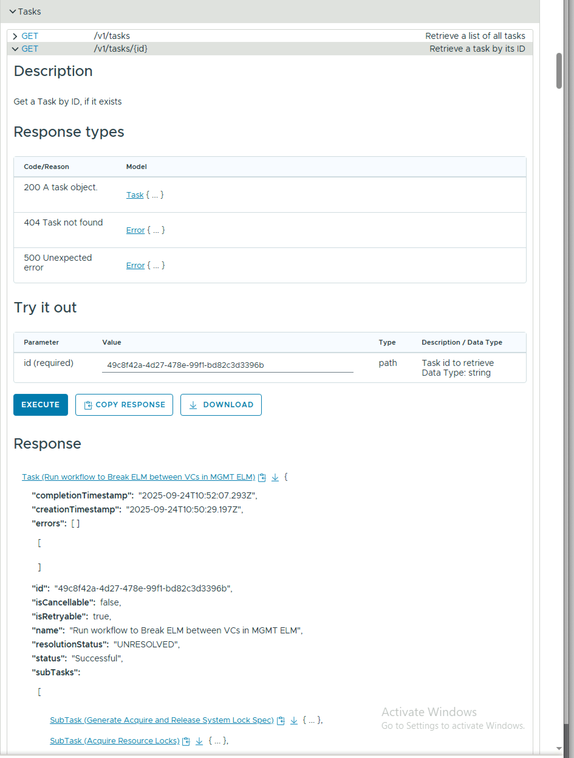 To monitor the task progress, expand GET /v1/tasks/{id} , enter the task id in the id field, and click Execute.
